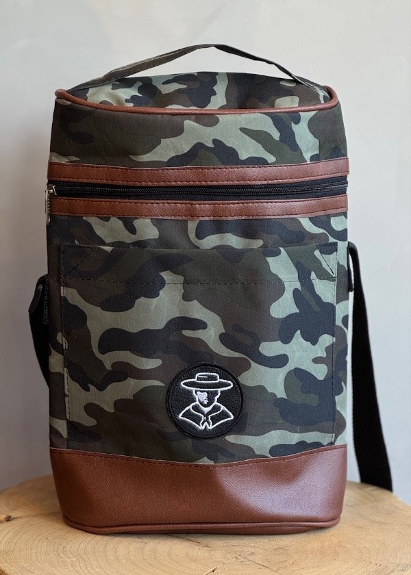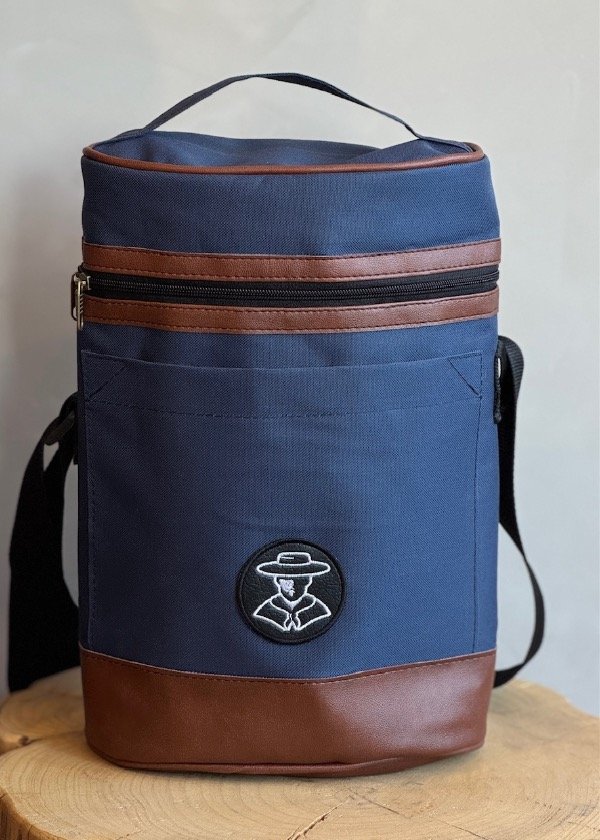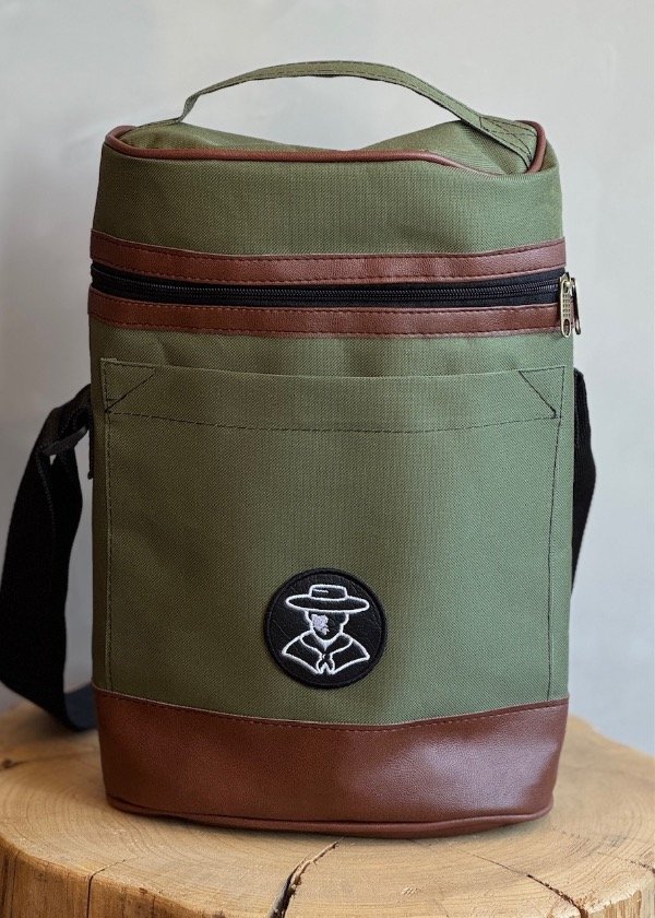 Matera tipo morral regulable de tela y eco-cuero, con espacio para kit completo.(compartimiento para bombilla). Bolsillo externo para usos múltiples