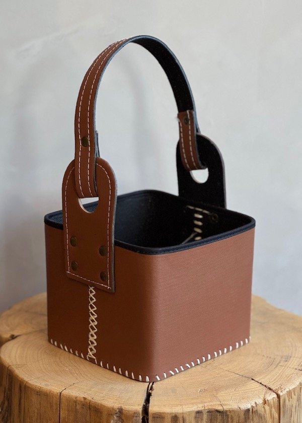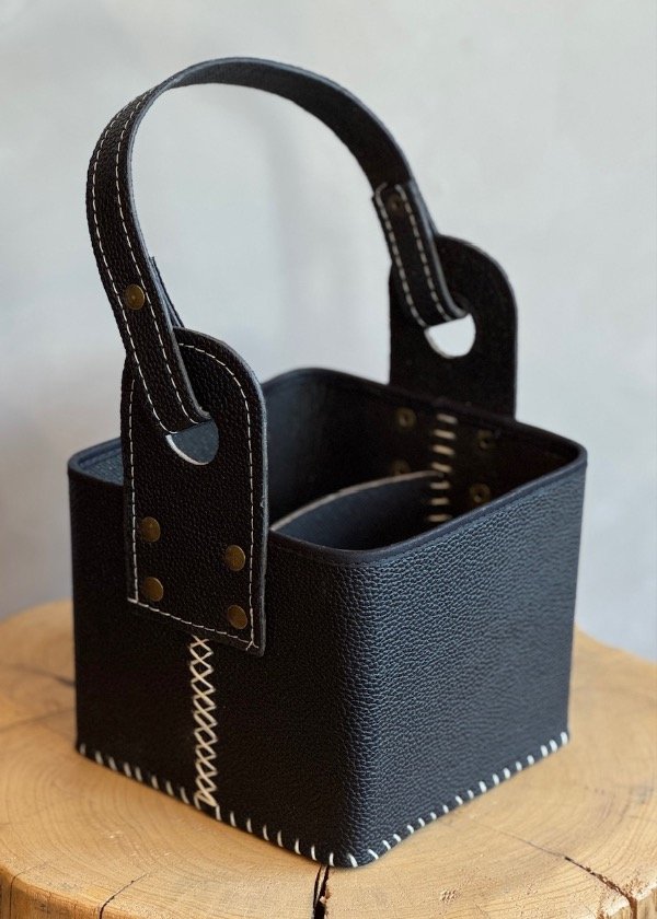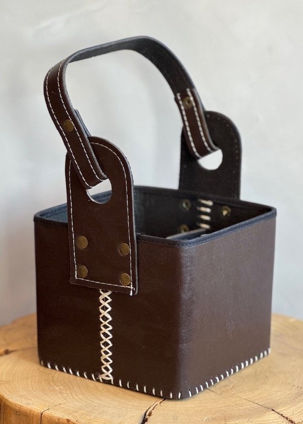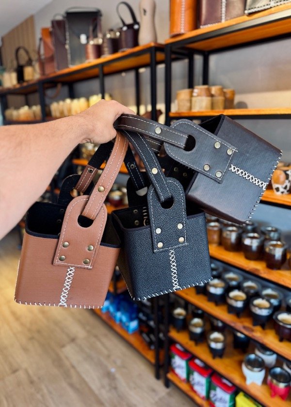 Matera cuadrada de cartón fenólico recubierto de cuero marroquinero. Con capacidad para mate, bombilla, termo, y yerberas.