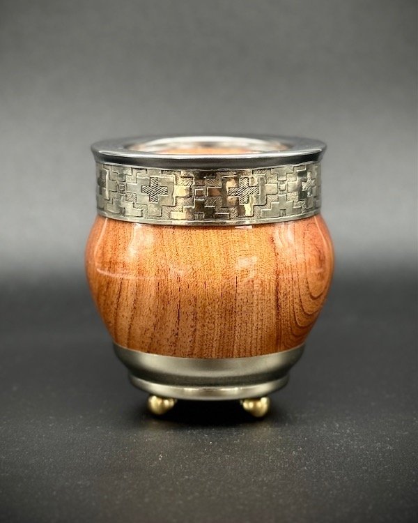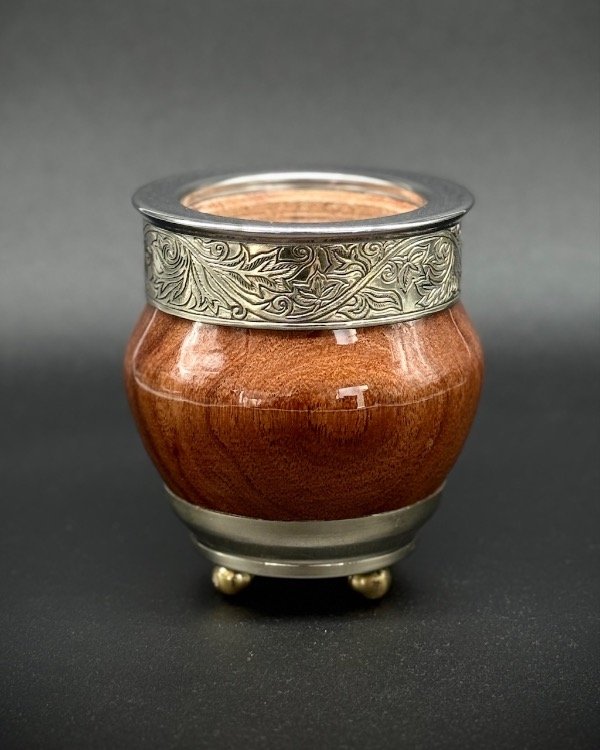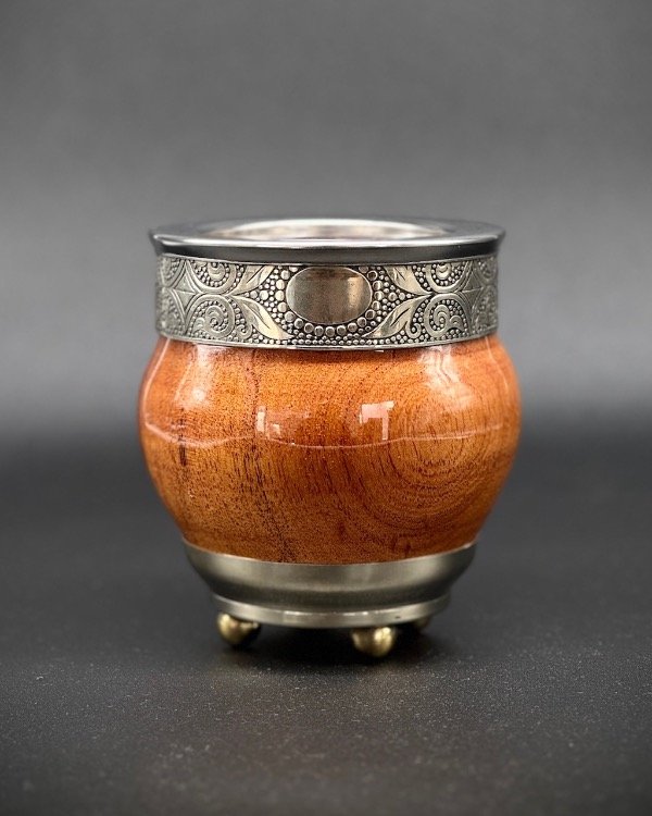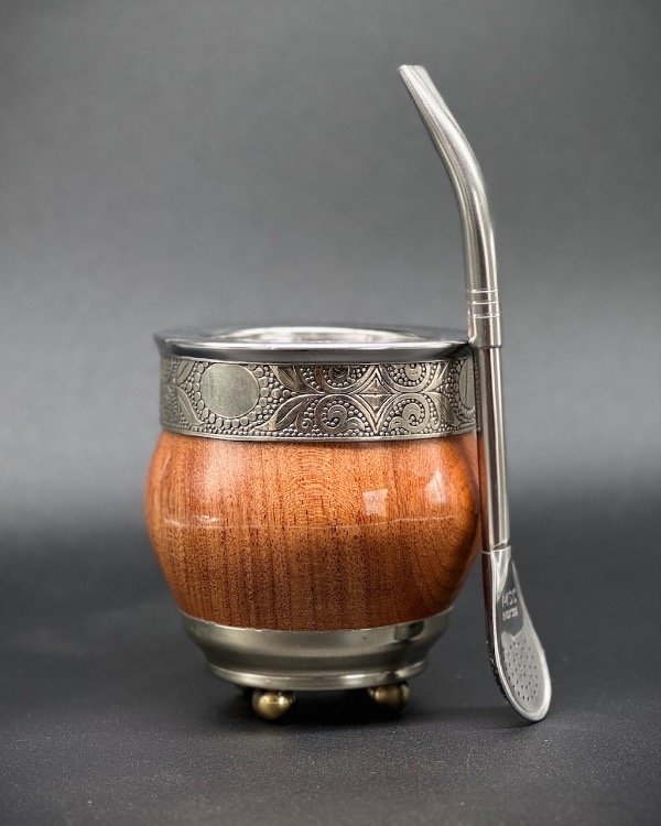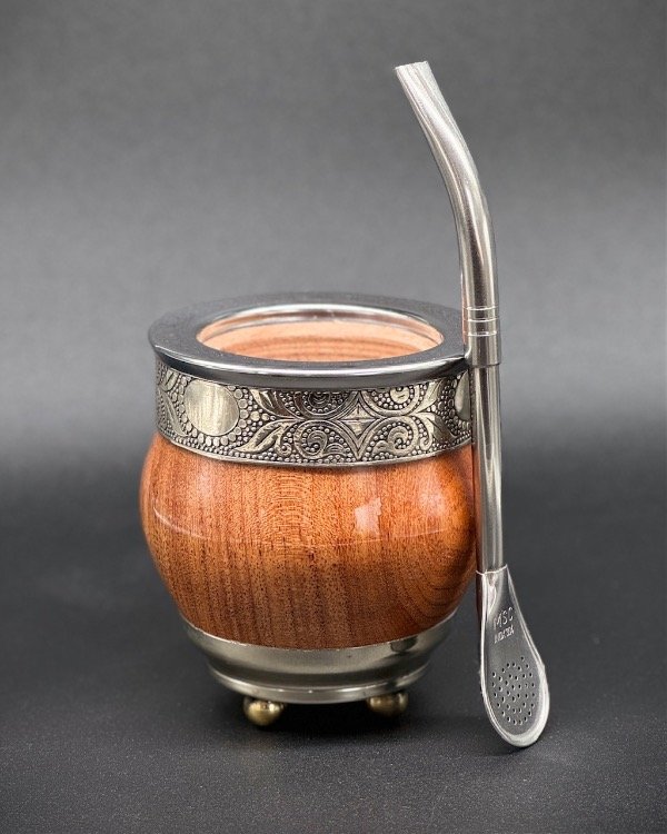 Mate de algarrobo fabricado artesanalmente con cinta de alpaca y virola de acero lisa. Con base de alpaca y pelotitas de bronce. Incluye bombilla pico de loro inoxidable, y grabado personalizado de REGALO