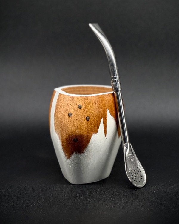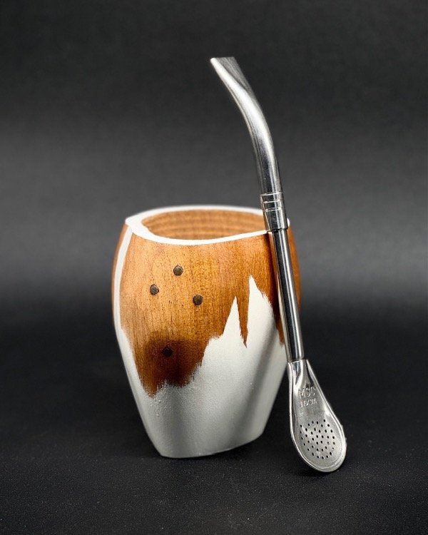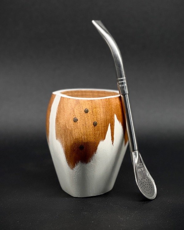 Mate de algarrobo pintado a mano artesanalmente. El mate incluye una bombilla pico loro inoxidable de alta calidad
