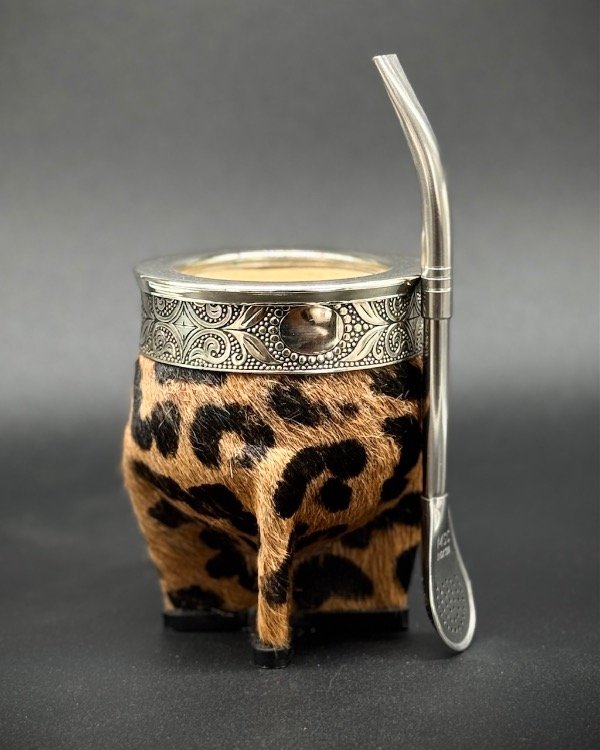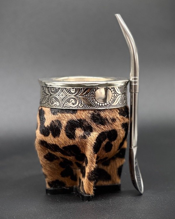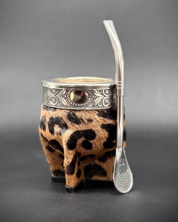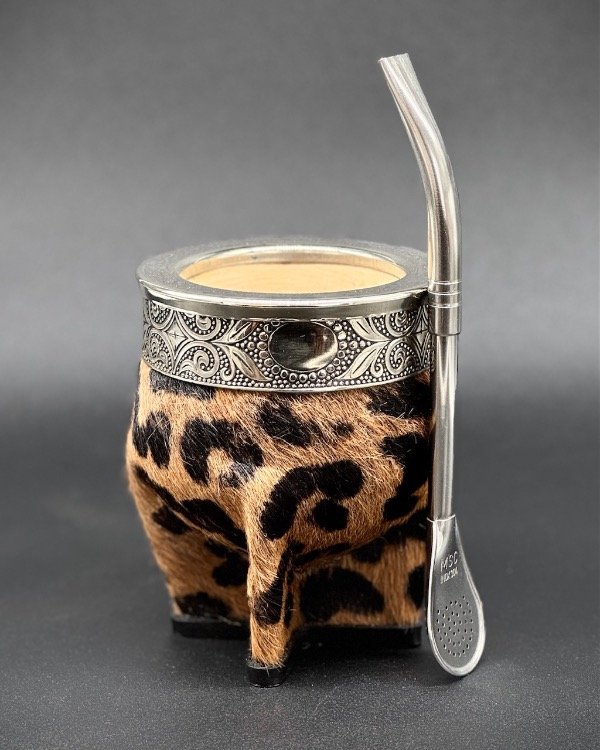 Mate de calabaza forrado en cuero animal print. Estilo imperial uruguayo con virola y cinta de acero lisa.